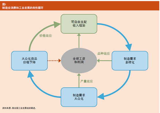 起初,隨著收入的增長,需求從必需品轉(zhuǎn)向更高端商品。如果具備足夠的工業(yè)能力,這一多樣化則可以成為借助新興產(chǎn)業(yè)促進(jìn)工業(yè)發(fā)展的強(qiáng)大推動力。反過來,制造業(yè)產(chǎn)業(yè)的擴(kuò)張和整合有助于提高生產(chǎn)效率和降低產(chǎn)品價格,從而通過大眾市場實現(xiàn)工業(yè)品的廣泛普及。生產(chǎn)效率的進(jìn)一步提高將有助于提高所有消費(fèi)者的購買力,進(jìn)而創(chuàng)造新的可支配收入并推動持續(xù)的良性循環(huán)。在這一良性循環(huán)中,隨著產(chǎn)業(yè)的興起和衰落,為消費(fèi)者、工人和企業(yè)家創(chuàng)造新的收入來源。