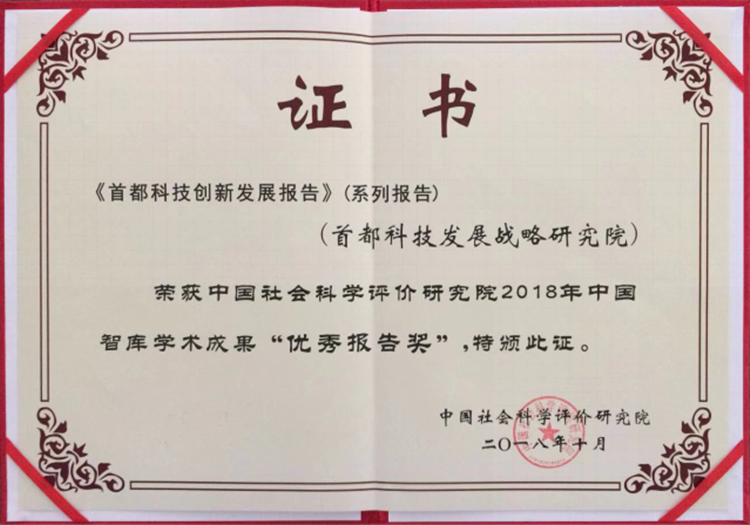 ???????首都科技發(fā)展戰(zhàn)略研究院研究發(fā)布的《首都科技創(chuàng)新發(fā)展報告》(系列報告)榮獲中國智庫學術成果“優(yōu)秀報告獎”。該項成果全國共有10份報告獲獎。