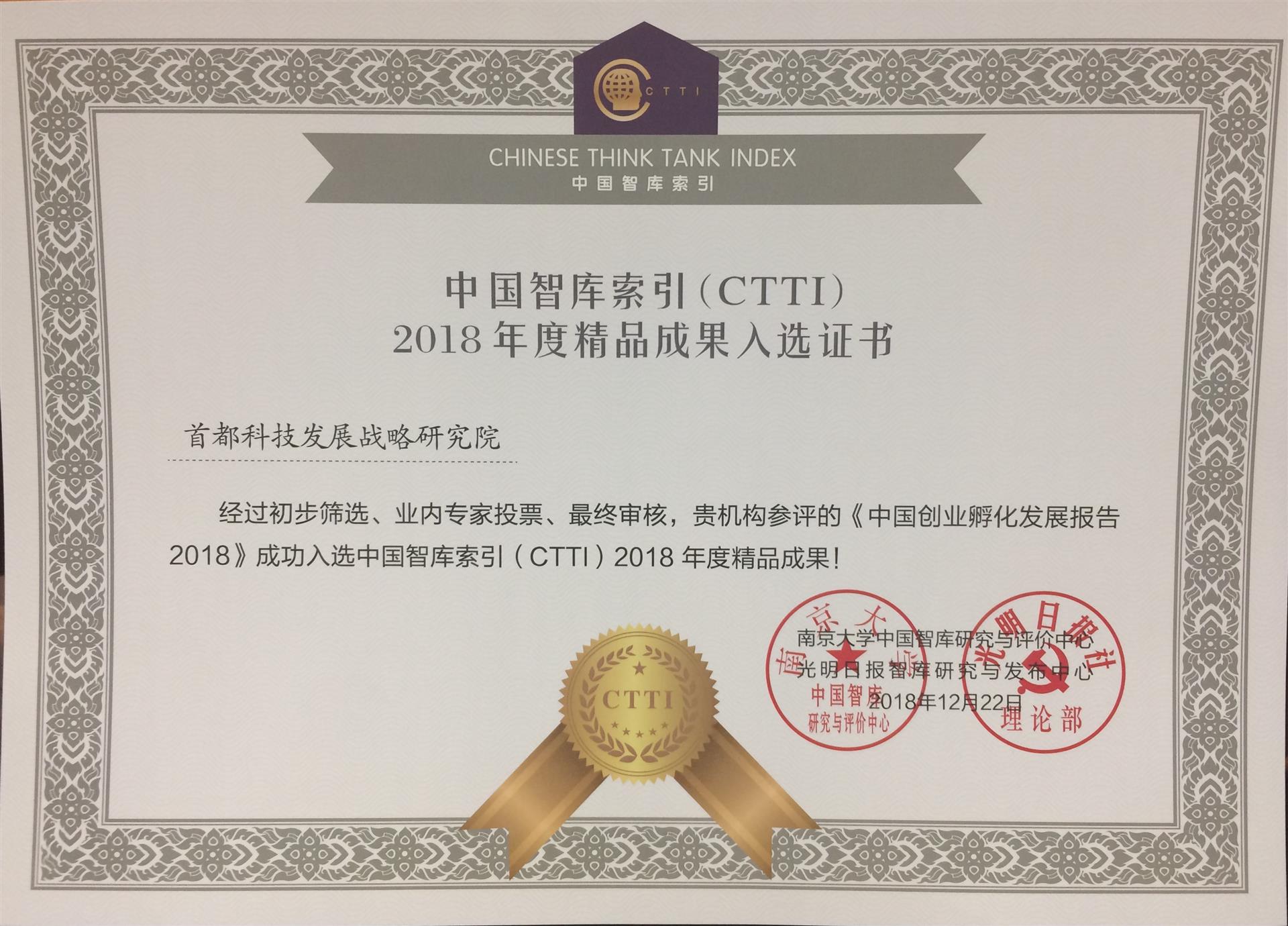 圖1:首科院研究成果入選中國智庫索引(CTTI)2018年度精品成果證書