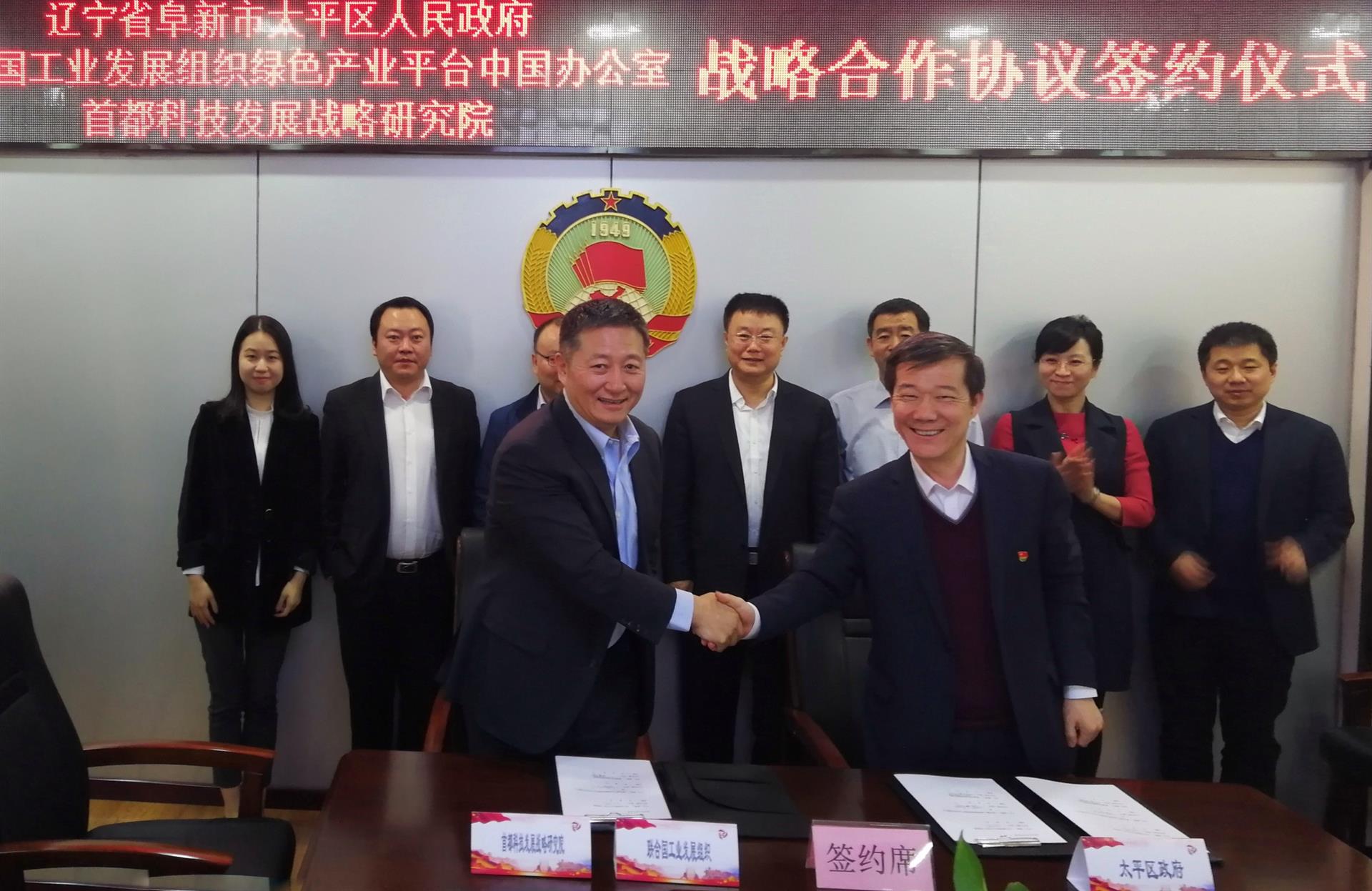 2019年4月18日,首都科技發(fā)展戰(zhàn)略研究院、聯(lián)合國工業(yè)發(fā)展組織綠色產(chǎn)業(yè)平臺項目管理辦公室與遼寧省阜新市太平區(qū)人民政府簽署戰(zhàn)略合作協(xié)議在京舉行戰(zhàn)略合作簽約儀式。